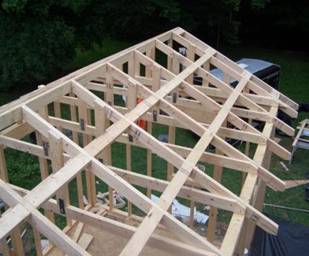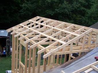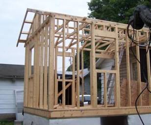 Here is the framework of a room addition . The room is a utility/wash room, it sets on top of a cellar which we have refurbished prior to the framing. ( see Concrete repair section for details ). We used treated lumber for the ceil plates. Plywood sheeting was screwed down prior to the metal roof. Scroll to bottom right corner of picture for Next Link. ing. |